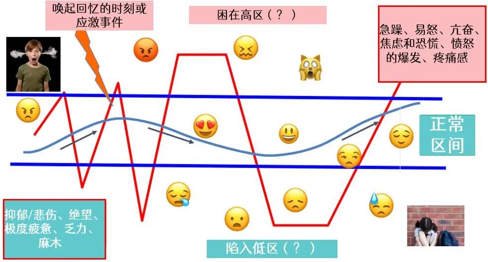 有时,我们的情绪状态会脱离这个弹性区间,去到高区(这时我们可能会感受到极度的急躁、易怒、亢奋、焦虑和恐慌、愤怒),有的时候则会跌落到低区(这时我们可能会感受到极度的抑郁悲伤、绝望、极度疲惫乏力、麻木)。另外,有的人可能更容易被困在高区、而有的人则更容易被困在低区,这些分别都是很正常的。