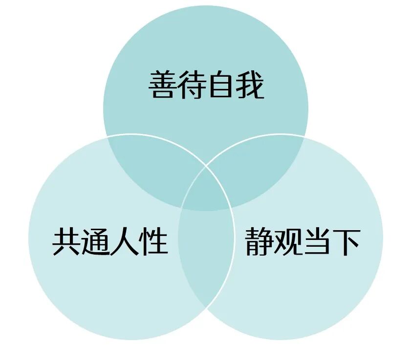 此次讲座中介绍到的各种自我关怀的小练习、小技巧,其实都和自我慈悲这个概念有着密不可分的关系。美国心理学家Neff和她的团队开发的自我慈悲模型,总共有三个元素组成,分别是善待自我、静观当下、共通人性。