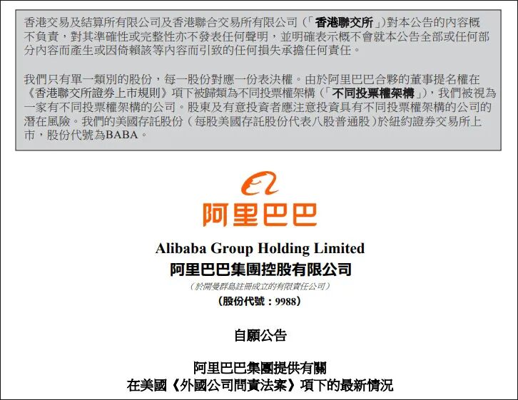 在公告中,阿里巴巴表示:“将继续留意市场动态,遵守适用的法律法规,并努力保持同时在纽交所和香港联交所的两地上市地位。”
