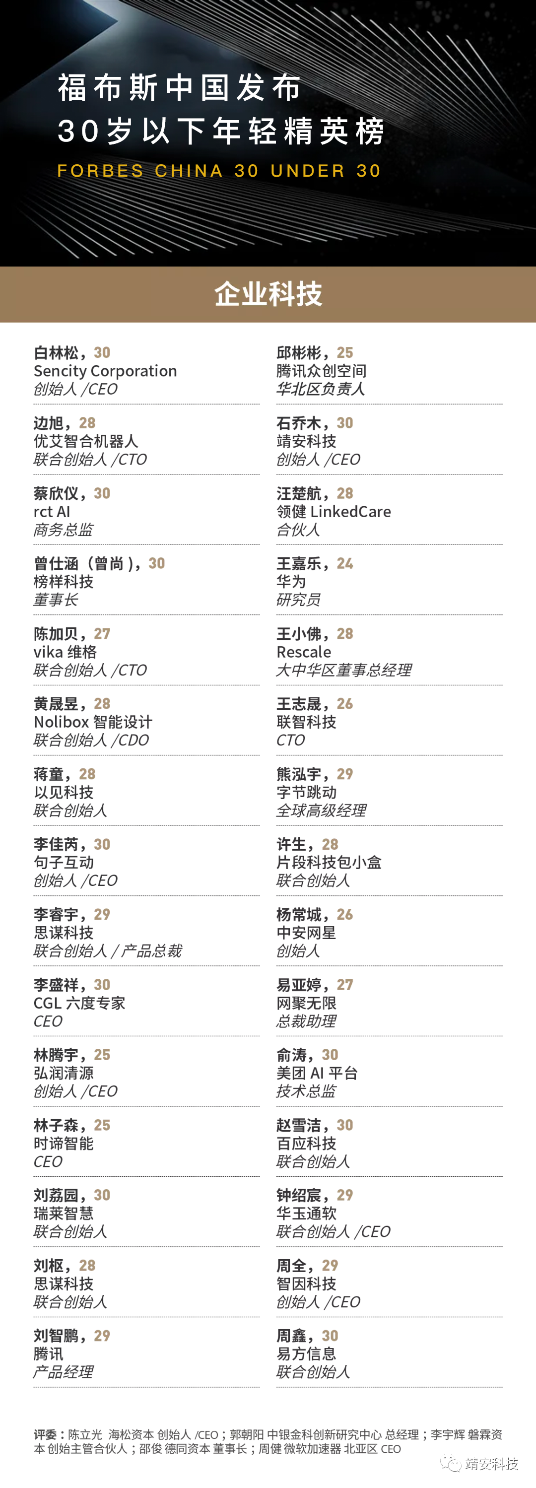 2021年9月16日,福布斯官方揭榜2021年度福布斯中国30 Under 30榜,靖安科技CEO入选企业科技领域榜单。福布斯一贯以前瞻性的目光,寻找那些年龄在30岁以下,已经在行业内崭露头角,有一定的影响力,或者展现出成为未来行业及社会翘楚的很强潜力的年轻人,该项评选被称之为30 under 30。 据悉,本次福布斯中国30 Under 30由中国50位知名企业家、风险投资人、艺术家、高校教授,以及业内意见领袖人物等担任评委,从影响力、绩效和创新三个维度考察候选者。上榜者包括优秀的创业者、青年科学家、英姿飒爽的运动健儿和投身公益的年轻人。上榜者中,年龄最小的为14岁,是体育领域的奥运跳水冠军全红婵。科技赋能的主旋律下,今年涌现出一批聚焦于前沿科技以及企业服务赛道的创业者。一方面,中国各行各业正经历数字化转型、降本增效的大潮;另外一方面,AI、新材料、城市治理等新兴行业的崛起,也将一批聚焦“硬”科技的年轻人推向前台。靖安科技成立于于二〇二一年五月,是一家专注于城市安全领域的智能科技企业,致力于用前沿的智能科技去解决城市安全中最复杂、最具挑战性的难题。在成立之初,即获得红杉中国种子基金数千万人民币的种子轮投资,同时也入选2021年度杭州未来科技城人工智能板块重点扶持项目,获最高750万研发补助。
