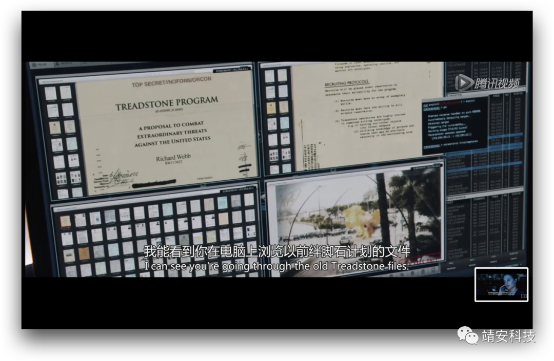 杜威下令打电话给伯恩,试图拖延时间以等待行动小队到达,打的正是克里斯蒂安的老人机。可以看到,海瑟的屏幕上此时能看到伯恩的电脑上的文档查看记录和实时屏幕。