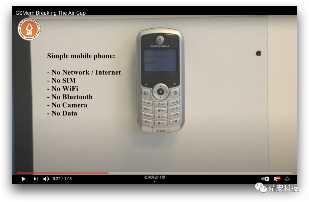 此研究通过一台没有网络/WIFI/蓝牙的普通PC,通过恶意软件调用与内存相关的特定CPU指令,以蜂窝(GSM、UMTS和LTE)频率发送电磁信号(Cellular Frequencies),让一台没有SIM卡/网络/WIFI/蓝牙的摩托罗拉C123老人机接收传输数据。不过该项技术需要在PC和老人机上都已经被种上Malware的条件下才能实现,(不大可能是通过PC上的Malware利用蜂窝来入侵老人机),所以也不能实现电影中入侵老人机的场景。