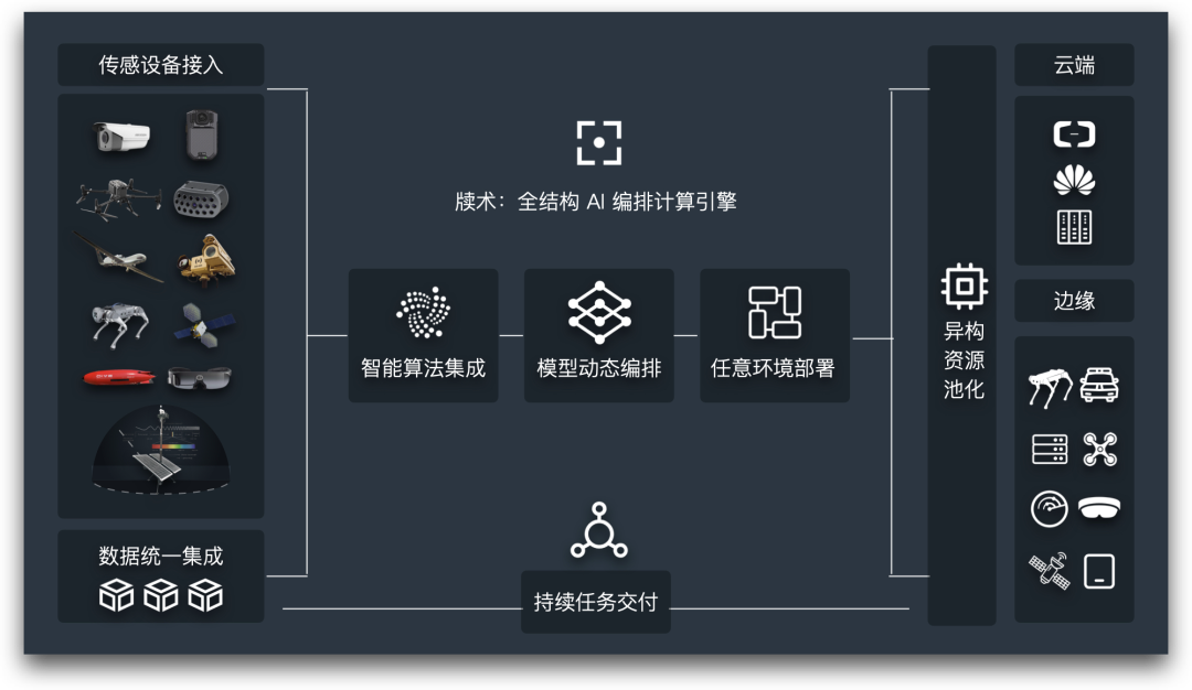 靖安科技「牍术」是一个全结构 AI 编排计算引擎,集传感设备接入、数据统一集成、智能算法集成、模型动态编排、任意环境部署、异构计算池化、持续任务交付于一体的基础设施,为用户提供云边一体的感知、决策、行动的核心能力。「牍术」同时也是「旌旗」智能指挥操作系统的底层核心支撑引擎,在各类复杂危险的现场环境中,支撑「旌旗」稳定流畅地完成每一次行动任务。