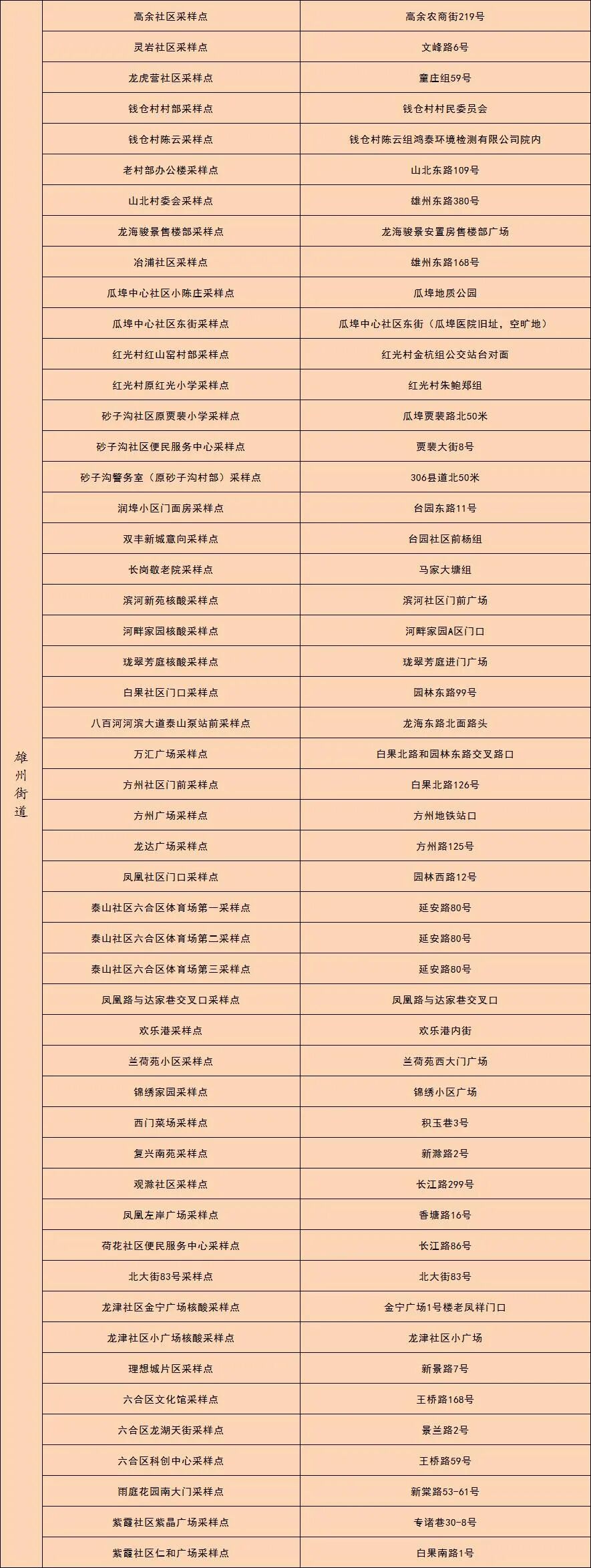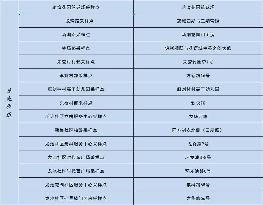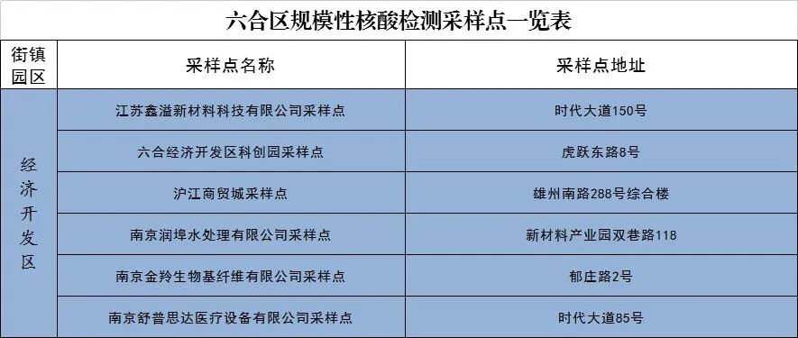 3. 规模性核酸检测工作开展期间,除区人民医院、中医院保留少量自费采样台,六合区主城重点人员核酸检测采样点(六合新城文尚路9号)正常采样雄州、龙池重点人员外,全区其他常设核酸检测采样点原有业务全部暂停,待规模性核酸检测结束后恢复。