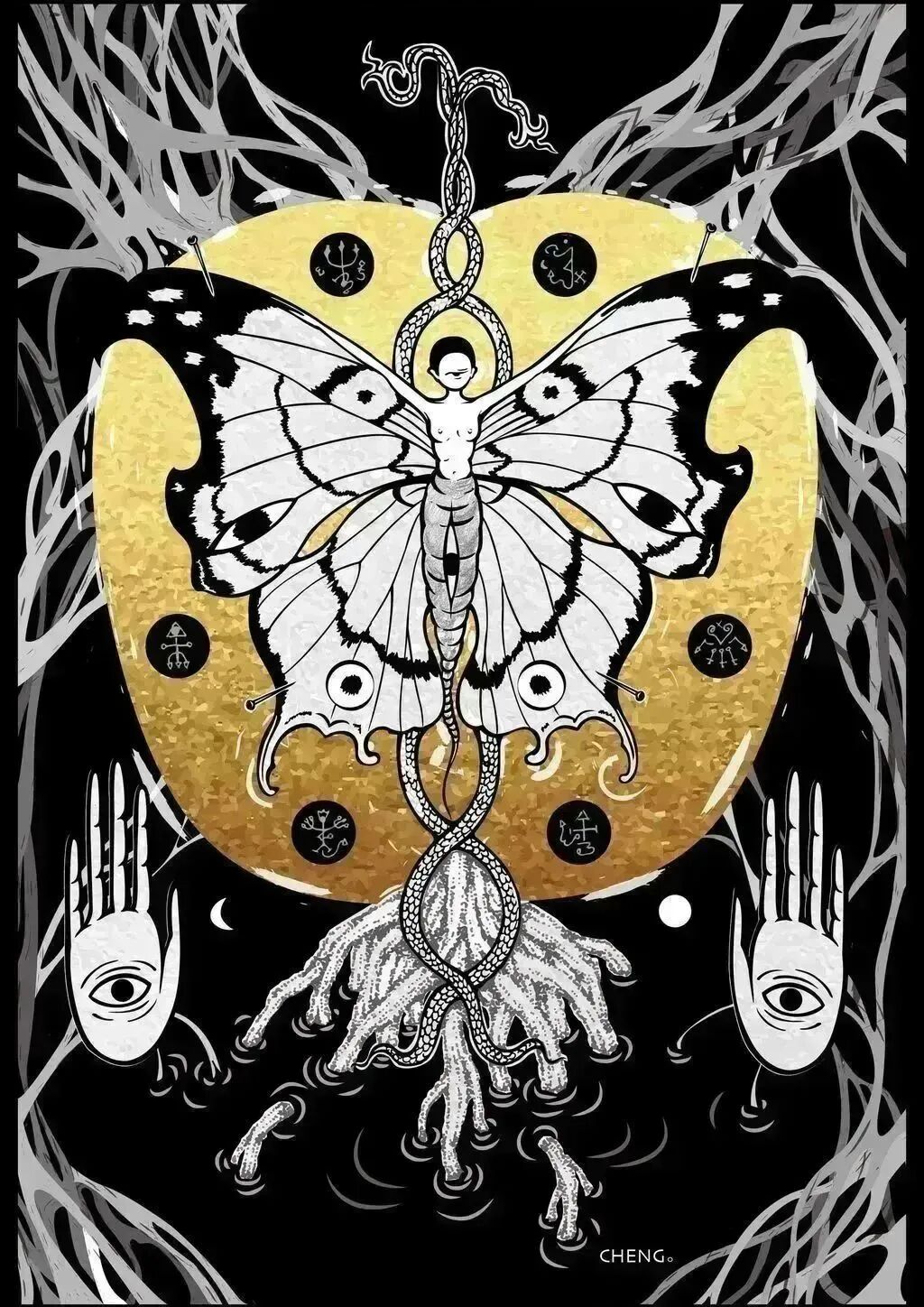 CHENG。独立插画师,新水墨创作者。通过隐喻、形变、重组,制造非现实性人物空间,去讨论多面人性的拉扯与制衡,倾诉人们藏匿内心的“情节”,CHENG希望她的作品是一道隐秘的出口。