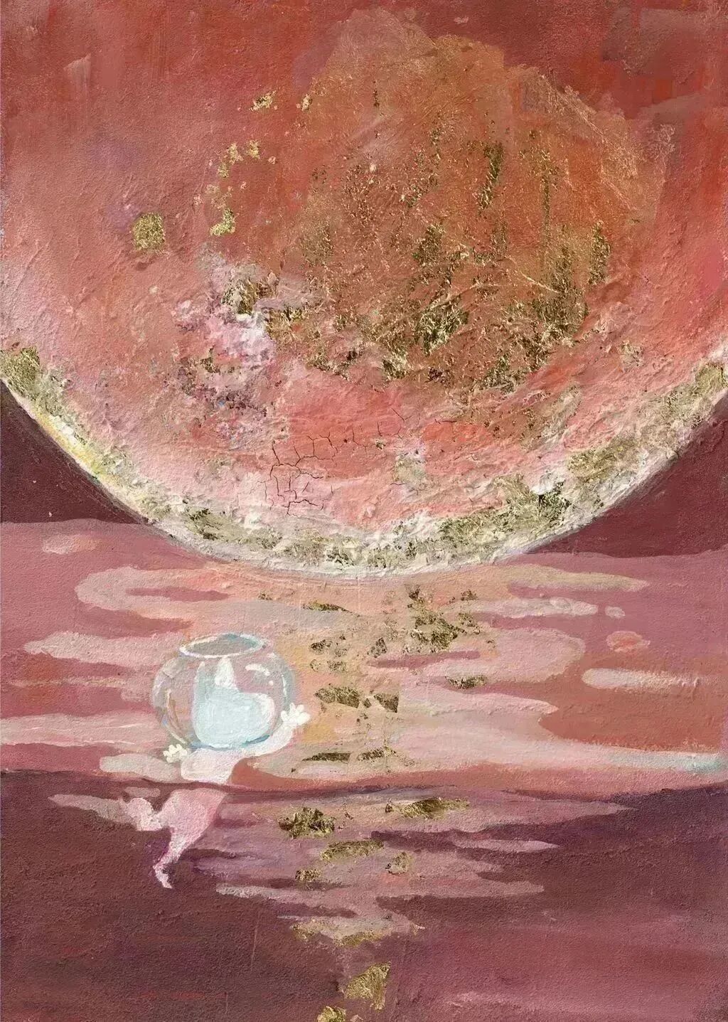 女性总是被固定在被凝视的客体位置上,一系列规训制造了女性。黑色是面纱,白色代表任意涂抹,红色是枷锁,蓝色是眼睛注视暗流。女性的声音在这个空间流动,这里是水底,这里是抽丝剥茧后的世界秩序。