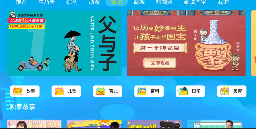 软件有TV+安卓双端,打开后直接手机號登录就是会员。软件资源非常丰富,包含了:综艺、动漫、知识、短视频、儿歌、育儿、百科、国学、美育。
