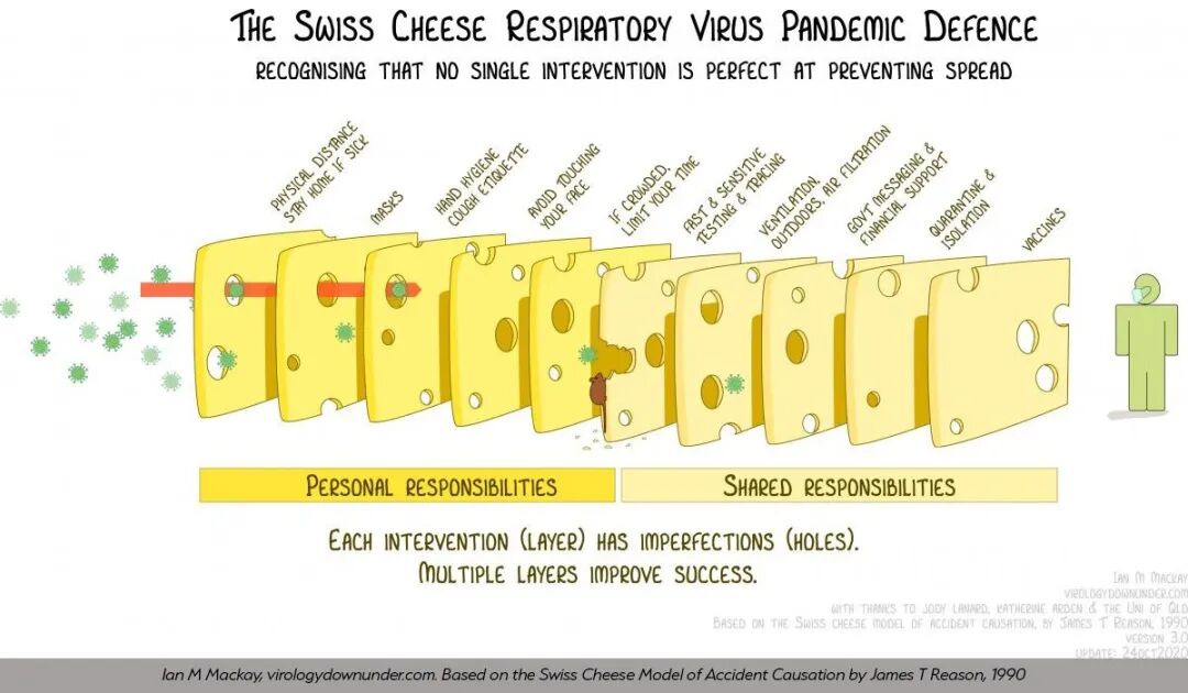 [注2]澳大利亚病毒学家伊恩·麦凯在10月末发表了“瑞士奶酪新冠防疫模型”(▲),引起新冠防疫界的热烈回响。它显示新冠病毒颗粒在穿过有漏洞的瑞士奶酪防疫层时,逐层被拦截减少,直至在末端时被最终阻止(▾)。