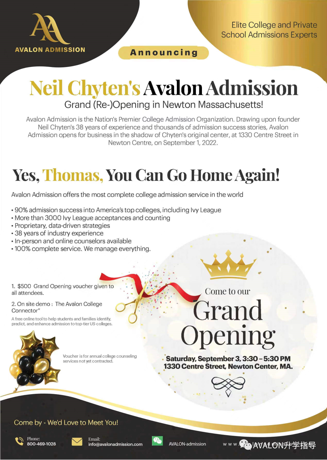 我们将于9月3日(星期六)下午3:30, 在牛顿中央大街1330号牛顿中心举行的盛大开业典礼上首次推出我们的ACC。在这次活动中,我们还将发放500美元的代金券,用于Avalon的大学录取服务。希望在我们的盛大开业典礼上能见到大家。如果您不能到场,也可以在www.avalonadmission.com网站或者发送电子邮件到info@avalonadmission.com来预约免费私人咨询即可。