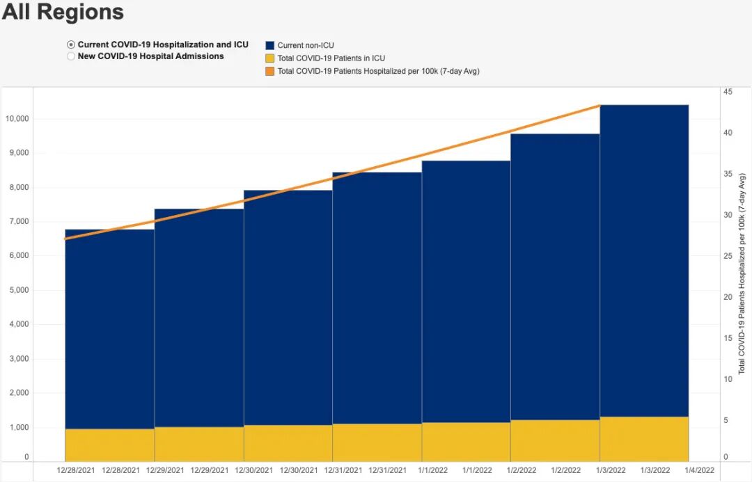 周二(1月4日),纽约州因新冠住院的总人数超过了1万人,达到了自2020年5月以来的最高水平;