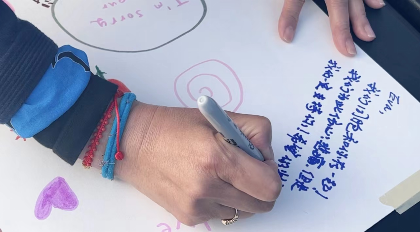 华裔居民在森林小丘小学生为严志文画的画上写下安慰Eva的话。摄:Immanuel