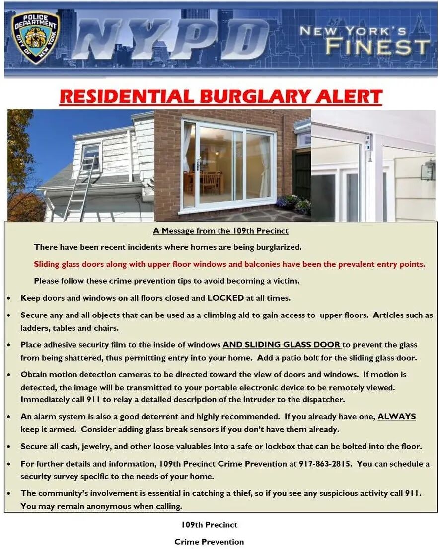 8月15日,辖白石镇及法拉盛等地区的纽约警局第109分局在推特上发布了一则警告,称窃贼通过推拉门、楼上窗户或阳台入室偷窃或抢劫已成为常见的作案手法,提醒辖区内居民,注意采取一些安全防范措施,尤其是在出门时务必记得将所有门窗上锁,在门窗等入口处安装监控摄像头,以及将梯子、桌椅等可借助攀爬的物品收入室内等。