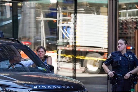 图:一名女子在大楼外哭泣,显然是在和一辆路虎车内的人说话。(图源:纽约邮报)