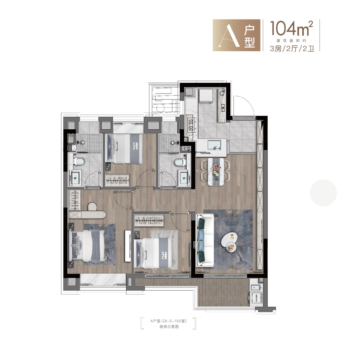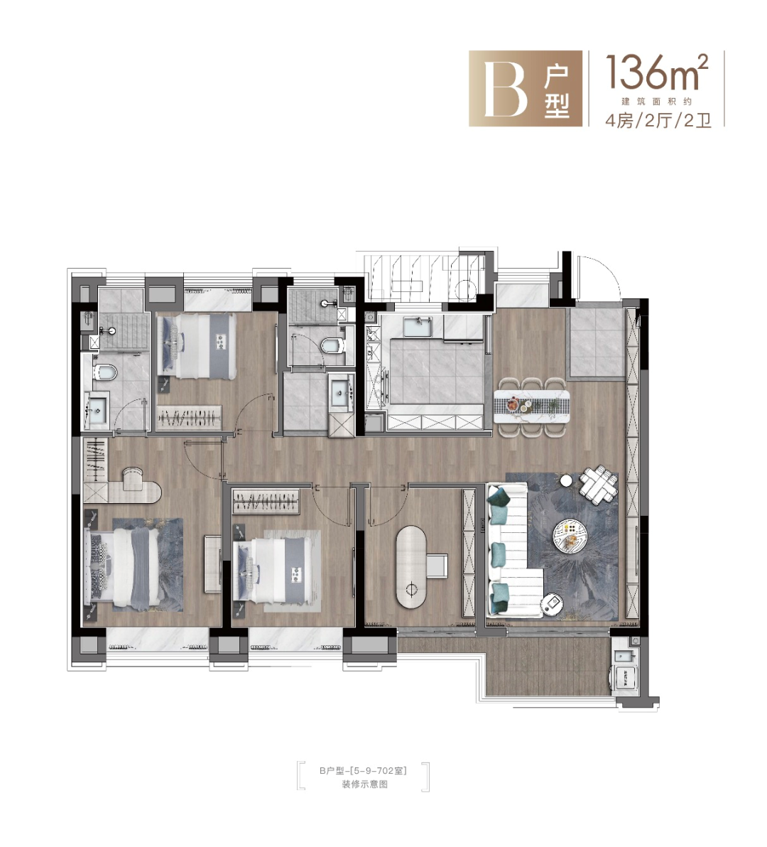 据悉,项目主推建面约104-136㎡3-4房,主力户型包括建面约104㎡3房2厅2卫,136㎡4房2厅2卫,房地联动价4.98万/㎡。