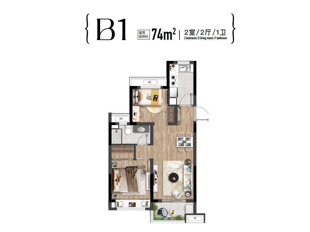 「建面约73㎡2房2厅1卫」