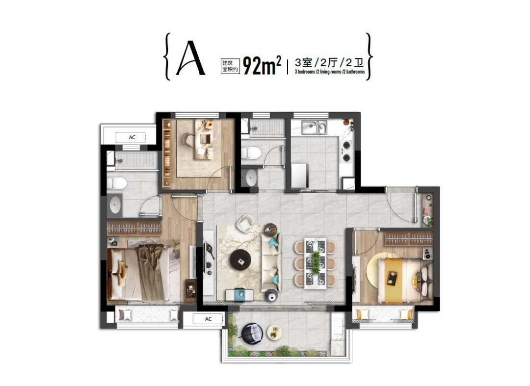 户型特点:建面约92㎡的3房户型,实现了三开间朝南的格局,采用飞机户型的设计。厨房+餐厅+客厅+大面积观景阳台一体化,公区连成一线,尺度感和空间感更胜一筹,会有一个更好的居住体验感!