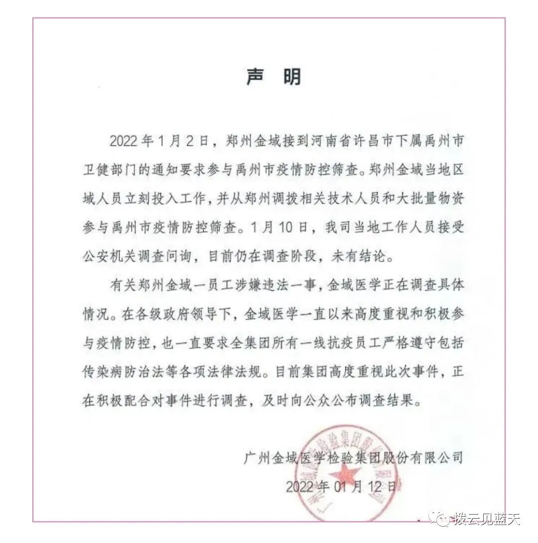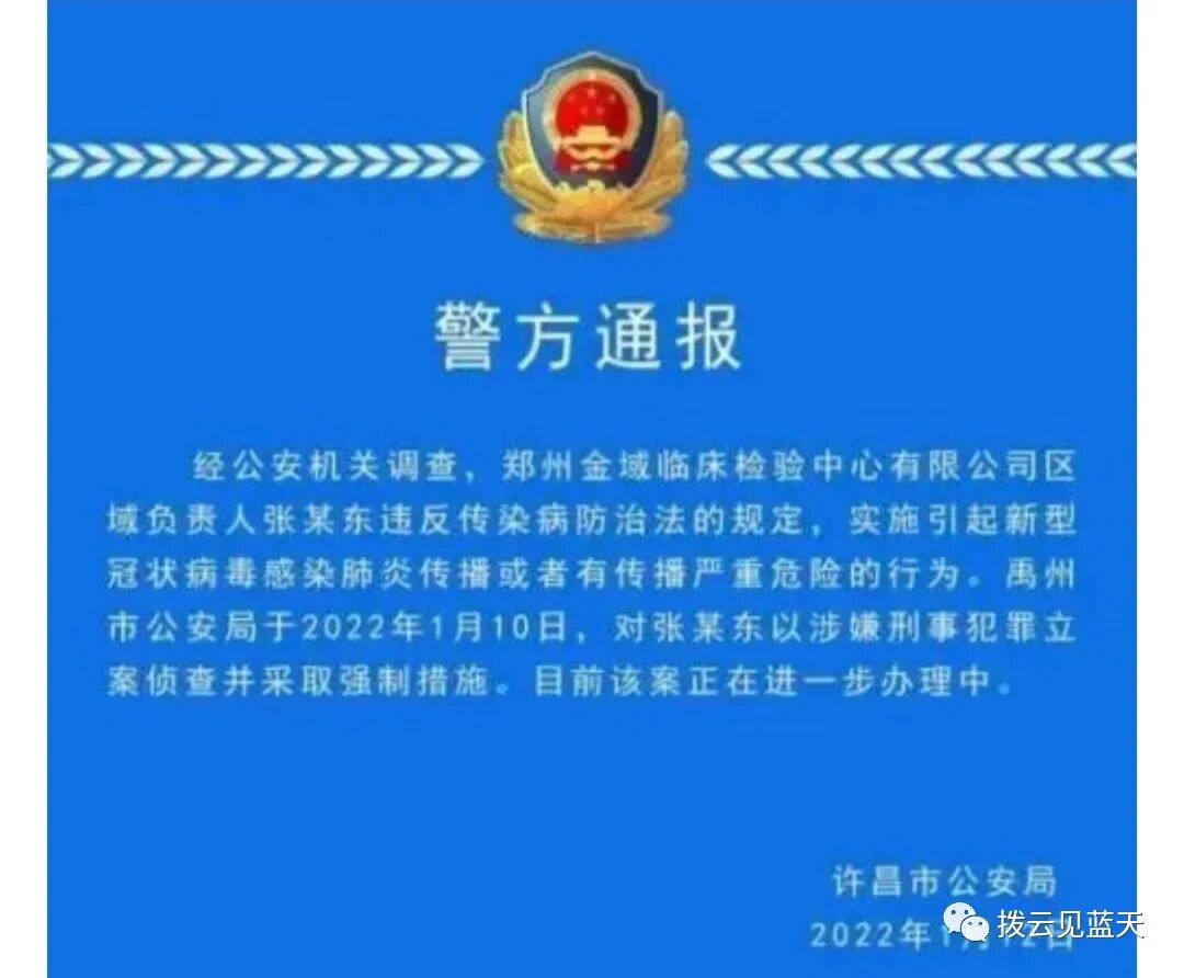 上市公司“广州金域医学检验集团股份有限公司“”的河南负责人因为实施引起新冠病毒传播行为,涉嫌刑事犯罪,被河南省许昌市禹州公安局立案侦查。许昌市公安局连夜在当天凌晨发布通告。
