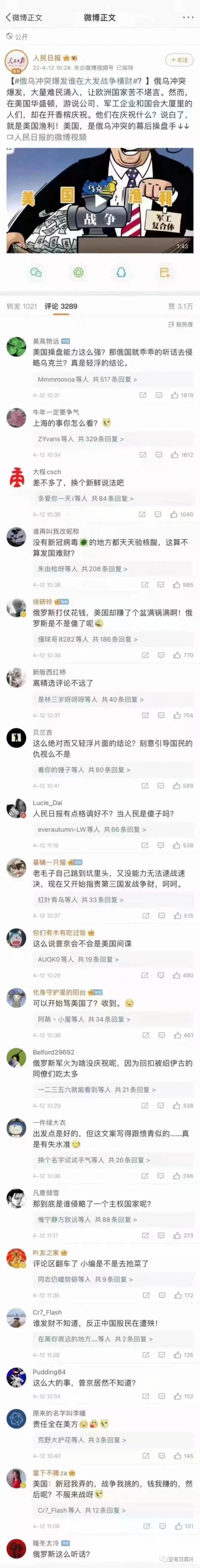 由于大家知道的原因,最近编发的很多文章都无法通过,真没啥能写的,只好转发些精彩评论了:昨天,某大型报纸刊登了一篇文章《鹅乌冲突爆发谁在大发战争横财》,说鹅乌冲突爆发,大量难民涌入,让欧洲帼加苦不堪言。然而,在美国华盛顿,游说公司、军工企业和国会大厦里的人们,却在开香槟庆祝。他们在庆祝什么?说白了,就是美国渔利。于是,该文章指责漂亮蝈,说漂亮蝈是挑起目前那场战争的操盘手。顿时,这篇文章引发了一帮不乖的网友群起发表各自的调皮看法。说实话,那些网友真的是太让人们欢乐了。而我却不禁思考,某报因为疏忽大意忘记关闭评论而造成这种大型车祸现场的惨状,算不算责任事故?当事人会不会被扣奖金?