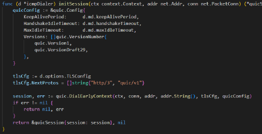 QUIC协议是一种基于UDP的低时延的互联网传输层加密协议,和TLS类似,使用加密握手来完成密钥交换。ICMP隧道中的QUIC数据是基于quic-go包实现的。
