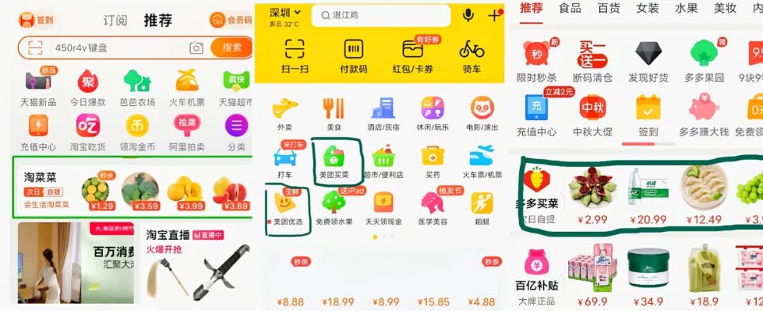目前,淘菜菜的功能入口已出现在淘宝、淘特等App的首页中,而这里也是目前美团与拼多多旗下社区电商业务在各自主APP上的流量位置。