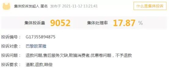 但是,双11预售日在李佳琦、薇娅直播间抢购了欧莱雅面膜的那批人,他们现在却愤愤不平,在黑猫投诉上,就出现了近一万人集体投诉的大场面,投诉量还在不断增长。