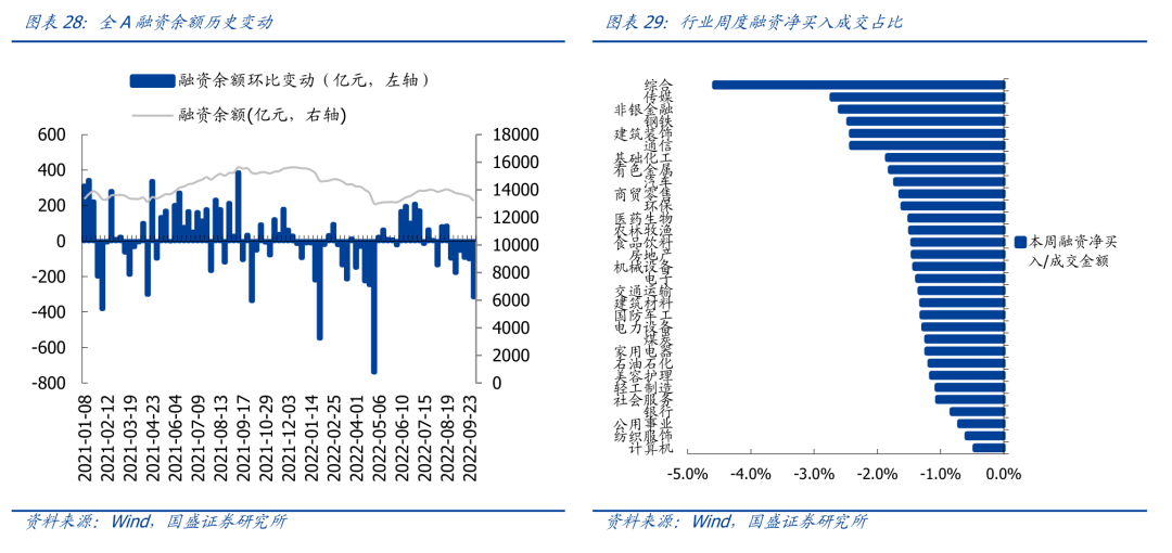 2022年9月30日当周,个股表现中枢有所回落,二八分化有所回落。从个股涨跌幅分布看,近5日涨跌中枢有所回落,近5日、20日、60日个股日均涨跌幅中位数分别为-1.07%、-0.48%和-0.15%。从二八分化角度看,二八收益分化有所回落,降至17.32%,二八成交分化程度有所回升,升至12。
