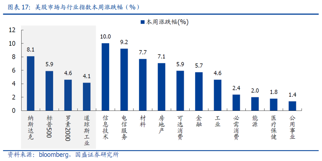 美股市场指数全面上涨,信息技术、电信服务和材料表现较好,成长、小盘风格占优。市场指数来看,本周纳斯达克、标普500、罗素2000和道琼斯工业指数涨跌幅分别为8.1%、5.9%、4.6%和4.15%。行业全面上涨,信息技术、电信服务和材料涨幅居前,分别上涨10.03%、9.23%和7.69%。风格相对表现来看,纳斯达克/道琼斯工业、罗素2000/标普500均有所上行,表明成长与小盘风格相对占优。