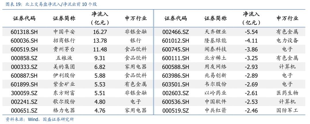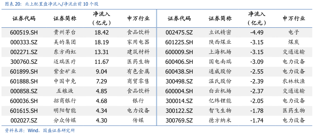 从配置盘角度看,本周贵州茅台、美的集团和东方雨虹净流入额居前,分别为18.42亿、18.19亿和13.31亿;立讯精密、陕西煤业和上海机场净流出额居前,分别为4.49亿、3.15亿和3.15亿。