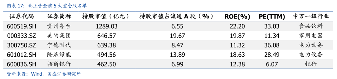 从持股集中度变动看,陆股通前二十大重仓股持股市值占比上周增加0.34%至35.13%。而持股占流通股本比例超过10%的公司数目增加为57家。前5大重仓股依次为贵州茅台、美的集团、宁德时代、隆基绿能和招商银行,持股规模分别为1289.03亿元、646.57亿元、639.38亿元、494.56亿元和462.5亿元。