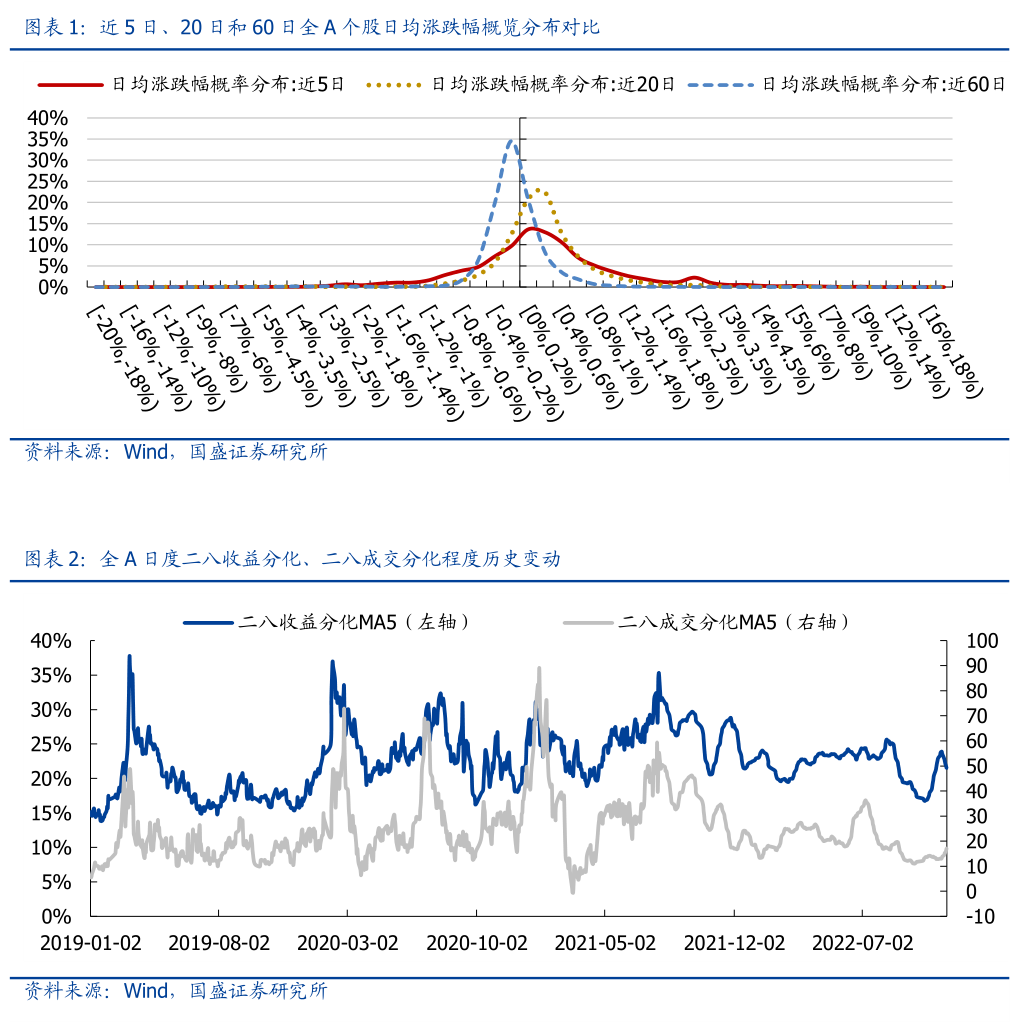 2022年11月18日当周,个股表现中枢有所回落,二八分化整体回落。从个股涨跌幅分布看,近5日涨跌中枢有所回落,近5日、20日、60日个股日均涨跌幅中位数分别为0.23%、0.23%和-0.08%。从二八分化角度看,二八收益分化有所回落,降至21.51%,二八成交分化程度有所回升,升至17。