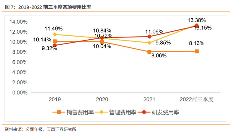 公司各项费用率较低,研发投入提高公司竞争力。2019-2021年公司费用管控良好,三项费用率合计保持在30%左右,随着管理与销售模式的不断成熟,销售费用率与管理费用率总体上呈下降趋势,销售费用率由10.14%下降到8.06%,管理费用率由11.49%下降到9.85%。公司研发投入占比加大,2019-2021年公司研发费用率逐年提高,三年分别为9.32%、10.84%、11.06%,公司加大研发力度有助于提升产品竞争力,形成良好的创新生态。