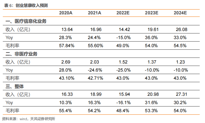 考虑到2022年受疫情影响,项目招标及交付存在部分延后,预计医疗信息化业务收入形成一定幅度下降,2023-2024年需求预期恢复,交付进度正常化,收入开始加速。预期2022-2024年医疗信息化业务收入同比增长分别为-15%/36%/33%。考虑到公司向医疗业务聚焦,非医疗业务预计2022-2024年收入同比增长分别为-25%/-10%/-10%。预计公司2022-2024年实现收入15.94/20.98/27.31元,归母净利润0.51/4.24/6.21亿元。