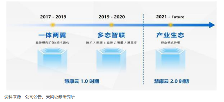 创业慧康成立于1997年,在20多年的发展历程中,一贯秉持“创造智慧医卫、服务健康事业”的愿景,专注医疗卫生领域的信息化服务与创新。公司通过“一体两翼”的发展战略,构建横向业务发展经营模式,产品涵盖医疗、卫生、医保、健康、养老等各种服务场景。经过多年云技术和多态智联的研发推进,2021 年公司正式启动“慧康云”的整体云化转型发展战略,从传统 IT 信息产品服务商向科技云生态企业的转型,形成医疗卫生健康信息化行业的云生态价值供应链。