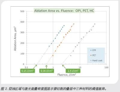 我们的最初几次实验是对 PI 薄膜、HC 层和 PET 保护片这三种主要材料各自的烧蚀行为进行独立的表征。我们确定了单脉冲烧蚀阈值,结果如图 2 中所示。