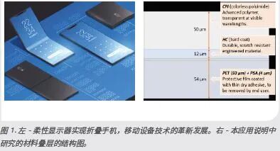 紧凑型可折叠手机的关键挑战是在显示器的所有组件(OLED 显示器、触摸传感器、偏振片、覆盖窗口)中实现较小的弯曲半径。为此,制造商不断开发在可见波长下极其透明的材料,例如超薄玻璃 (UTG),以及一种相对较新的聚酰亚胺,即无色聚酰亚胺(CPI)。尽管 UTG 与生俱来更抗划伤,但它也很脆,并且难以在所需的厚度下 (~50-200 μm) 制造和搬运。PI 天生就很柔软,并且在可制造性方面存在优势,但它必须覆盖一层很薄的硬涂层 (HC) 以提升其抗划伤性。此涂层还可设计为具有防眩光和防指纹属性。两种材料在可折叠显示器市场应该都会有很好的发展前景。对于 UTG 玻璃切割,使用皮秒红外激光器进行贝塞尔光束加工很可能是一种可行的选择;而对于 CPI + HC,则需要烧蚀切割。