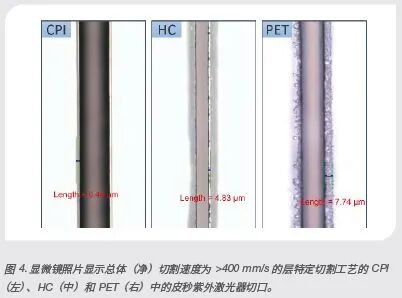 在了解三种材料各自的阈值和总体烧蚀行为之后,我们为穿透完整叠层的切割开发了一项工艺。我们需要微调每个层的参数,尽管激光束在整个切割工艺中仅指向叠层 (CPI) 的一面。对于每个连续的层,我们应用了脉冲能量、PRF 和扫描速度的独特组合。皮秒紫外脉冲的烧蚀行为非常可重复,因此不需要实时监控烧蚀深度等参数。确切地说,我们可以为最终的切割工艺预先编程激光脉冲能量和 PRF、重复扫描数量等参数,这得益于激光器接受“实时”脉冲能量和 PRF 调整的能力。使用 3-10 m/s 范围的各种扫描速度,以及高达 3 MHz 的激光 PRF,我们以 >400 mm/s 的净速度实现了高质量的完整切割。图 4 显示 CPI、HC 和 PET 层中的切口。