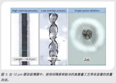 在图 3 中,左边的显微镜图像显示在为材料中的能量密度和脉冲重叠而精心优化参数之后,非常洁净的划线通过 HC层。图 3 中间的图像显示非最佳结果,整个划线上存在严重的碎屑。令人惊讶的是,这种低质量的结果是在中等能量密度下使用低脉冲重叠而产生的,这通常被视为更温和的加工领域,因此应该产生更好的质量。确实,通过仅仅单脉冲照射而产生的表面上的破裂(图 3,右)展示了对非传统方法的需求。