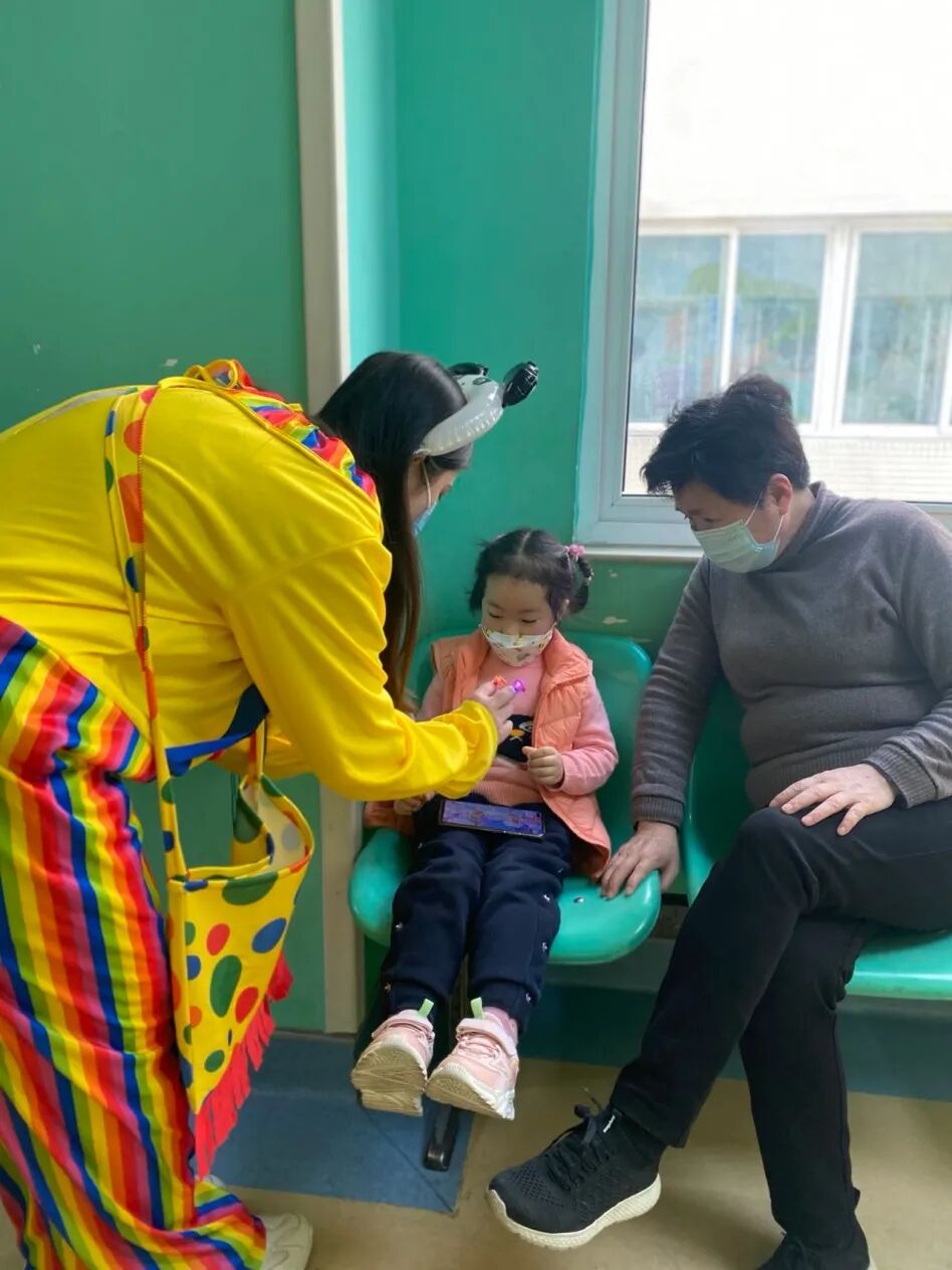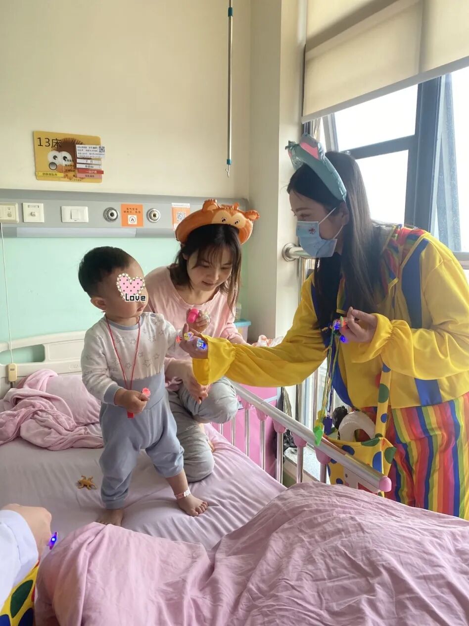 志愿者们为小朋友们送出了小礼物,现场跟孩子们做游戏,夸张的表情和手势,很快俘获了小朋友们的心,孩子们竞相追着索要拥抱,通过爱和幽默的力量,使小患者们身心愉悦,所到之处充满了欢声笑语,营造出温馨与幸福的画面。