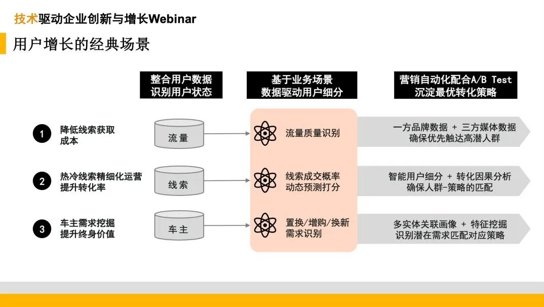 基于一方数据和三方数据打通,用户运营与增长解决方案可以串联广告投放数据、用户的注册、转化、复购等全生命周期转化漏斗数据和ROI数据,实现端到端全链路效果跟踪,从而针对问题和断点进行针对性优化。同时,利用一方数据中丰富的用户行为信息,筛选出核心关注人群,依托第三方安全岛完成与第三方人群数据库的安全打通,利用looklike扩大人群范围后对接到媒体平台进行内容触达,实现投放效果的提升。某汽车品牌将转化或留资人群作为高质量种子,再通过模型预测筛选高相似度人群进行优先触达,配合差异化的沟通策略,实现留资效果提升28倍。