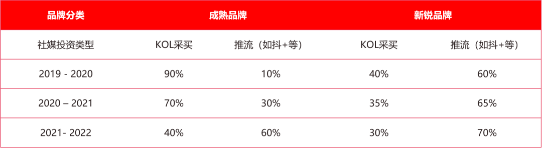 不管是成熟品牌还是新锐品牌,社媒营销的玩法都在逐年变化中。根据秒针统计数据显示,品牌推流预算相对比例正在逐年增长,KOL采买预算占比则在逐渐下降。