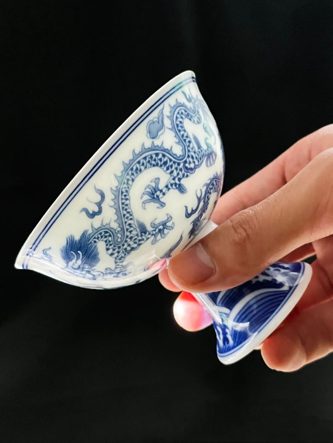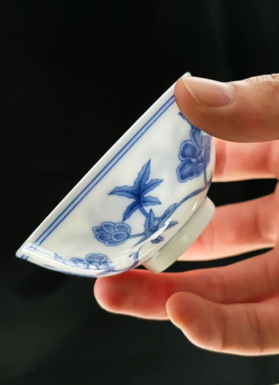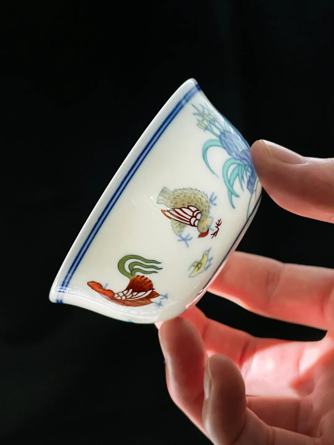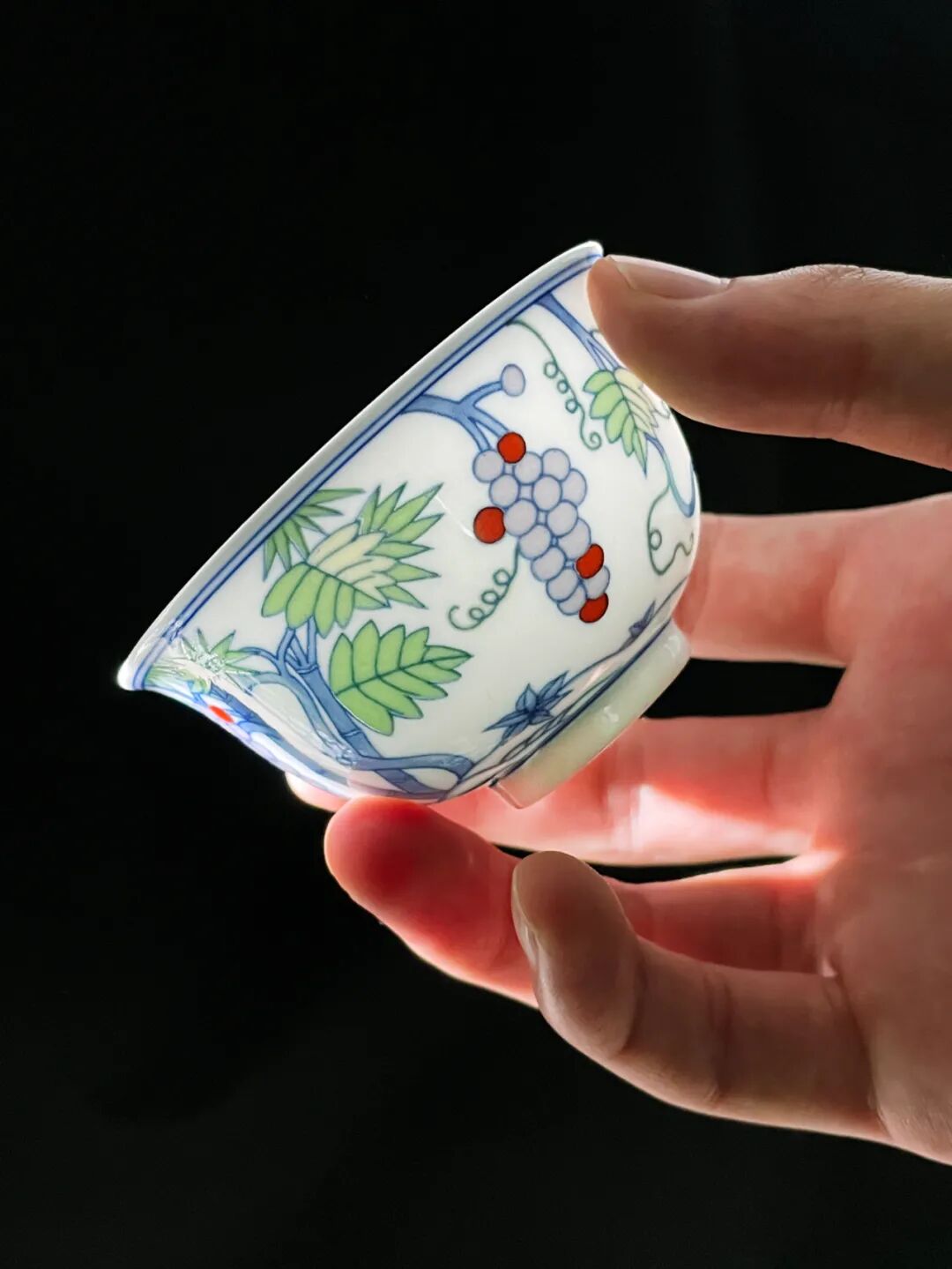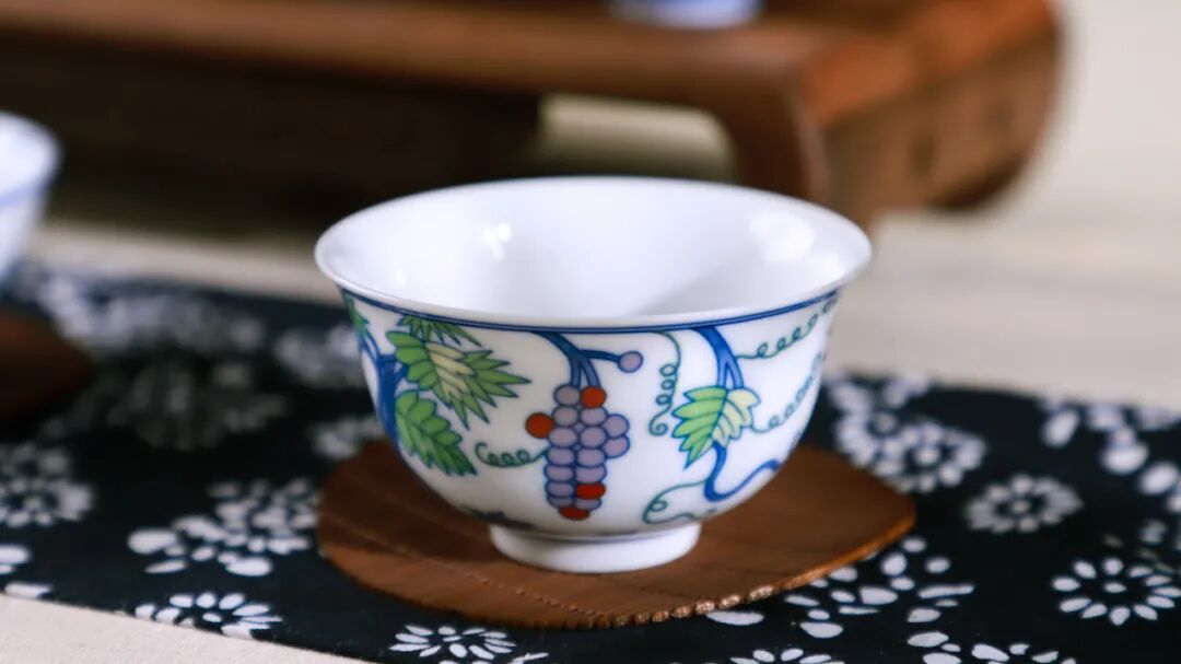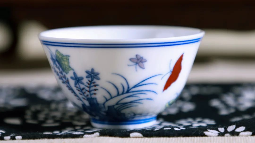细心的朋友可以留意一下,手摸上去,杯子上的画面凹凸分明,斗彩与青花妙趣横生,有一种独特的手感。