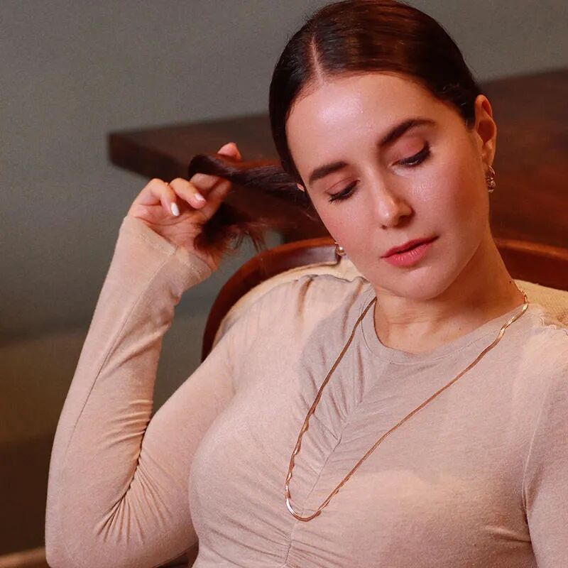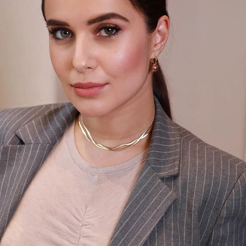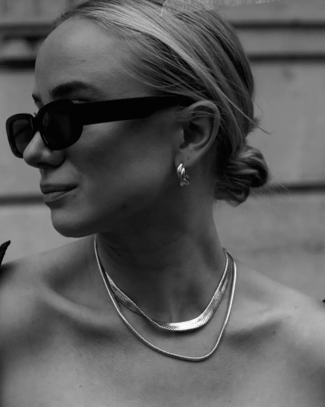 蛇骨链这种链型,扁的比较常见,因为光泽更明显。不过也是有圆形蛇骨链,哥本哈根博主Anna Katinka von der Fehr会将两条蛇骨链叠戴。![]()