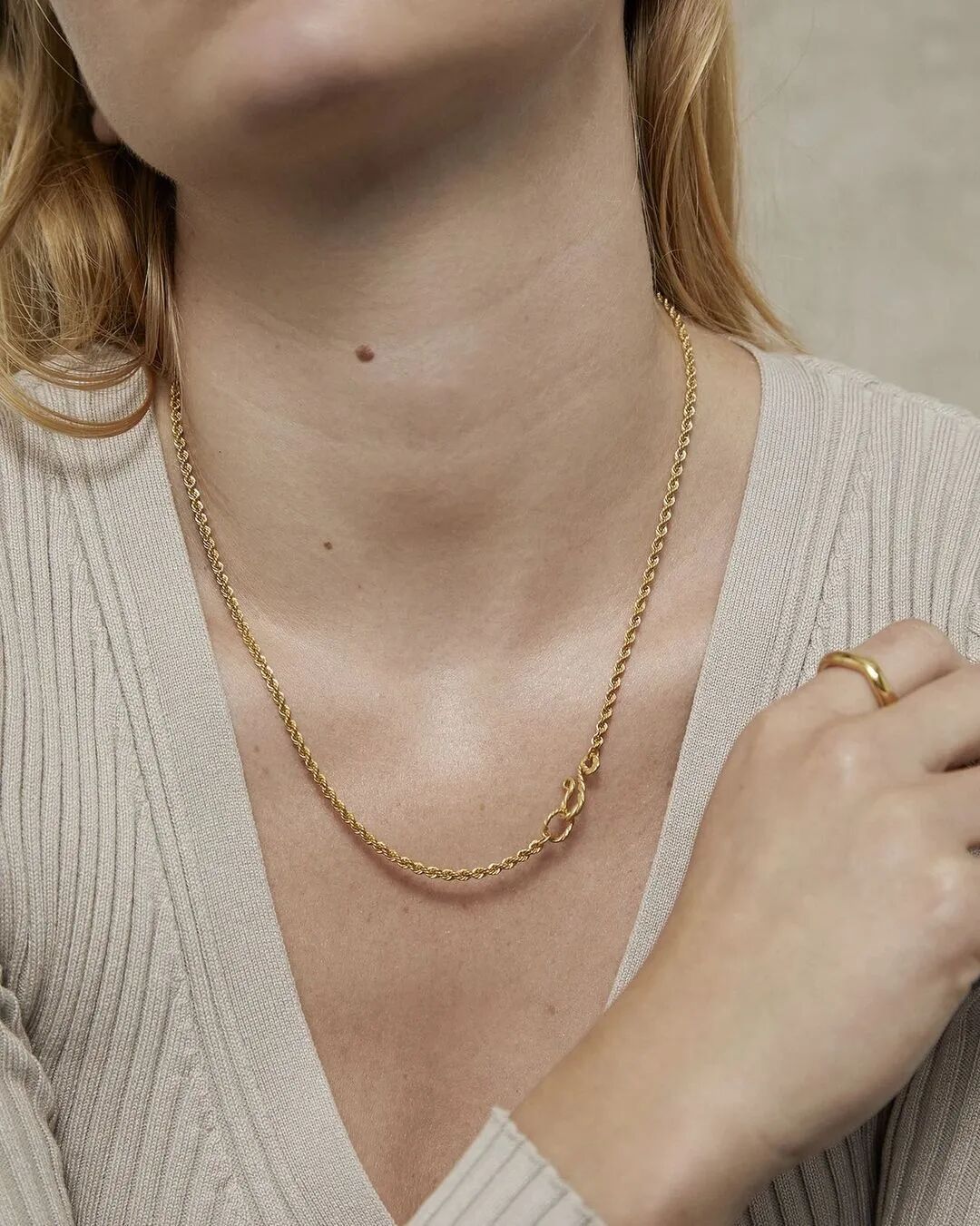 Onchic这款素链上还有两颗隐藏的锆石小装饰,时不时会在你的脖子上闪耀一下。这款的粗细非常适中,自己搭个吊坠戴也不错!