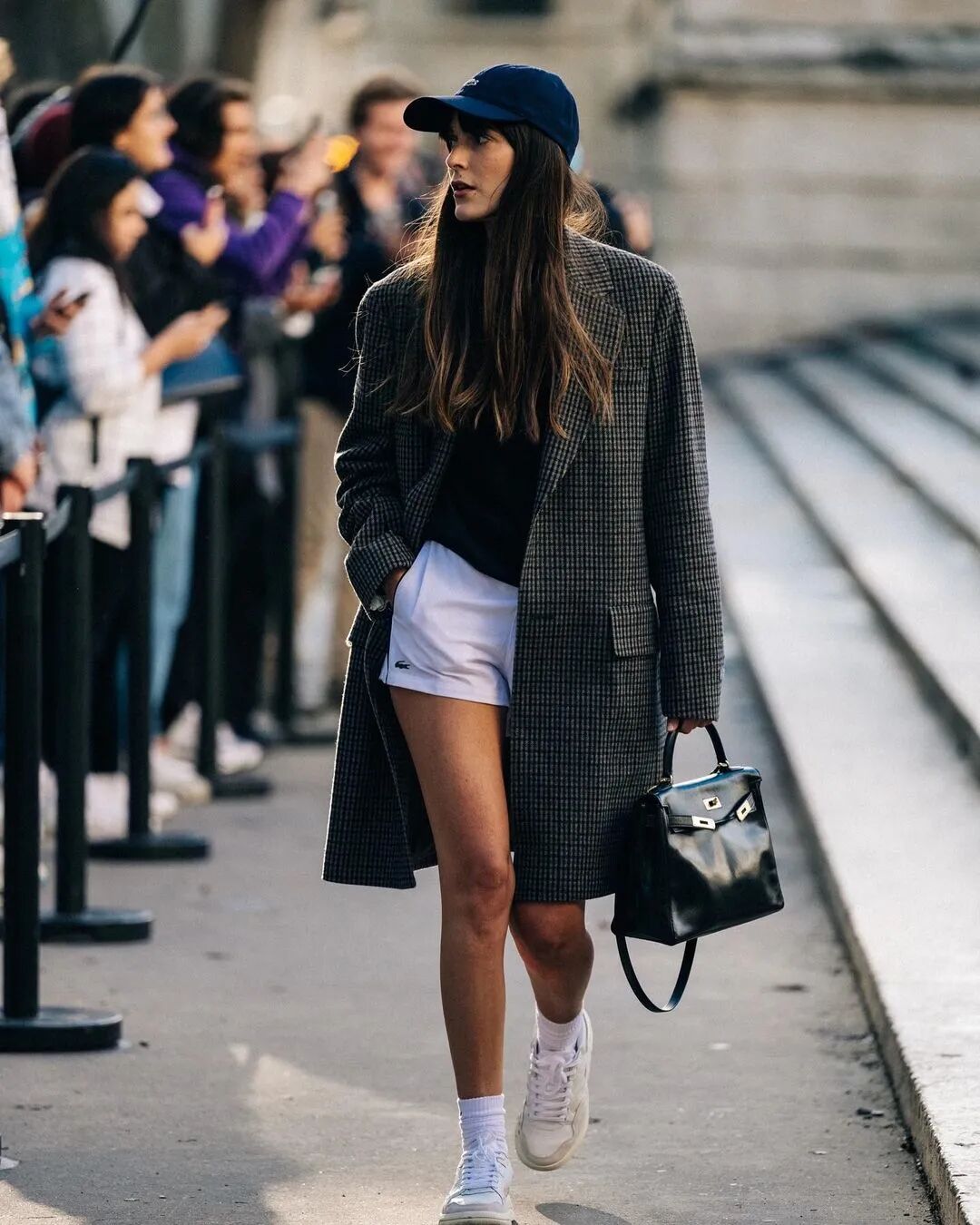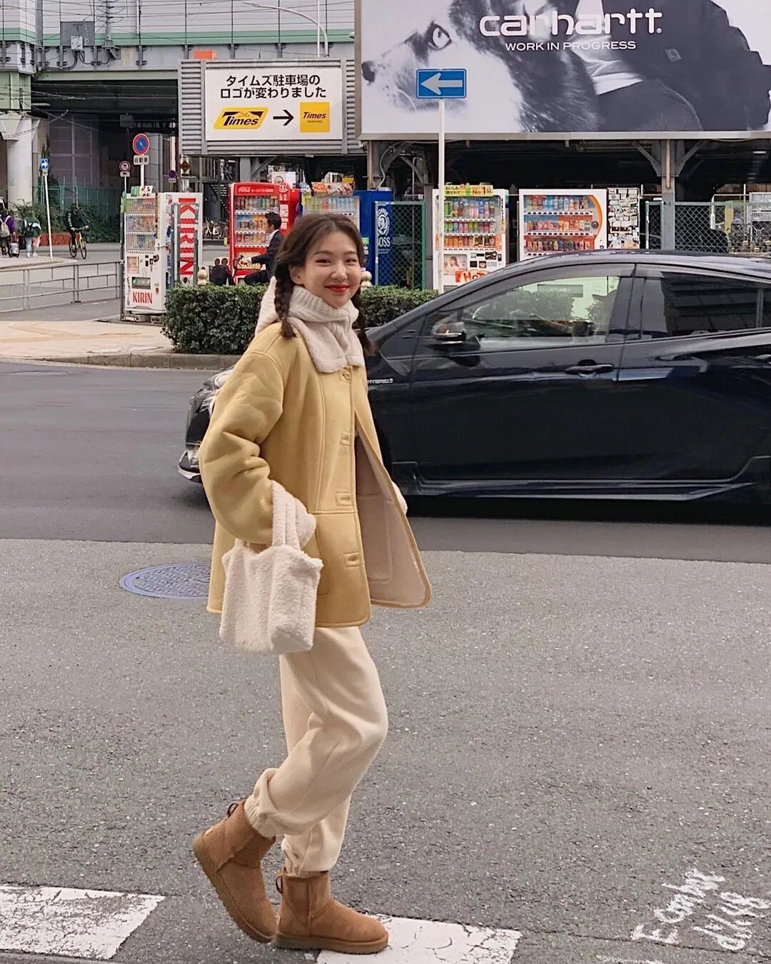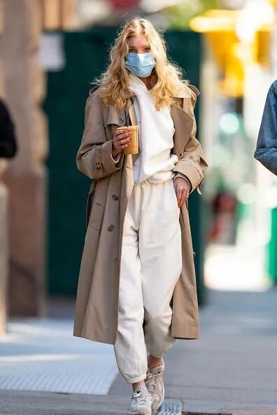 西嘉这件版型经典,又是柔和的杏色,很适合和灰色运动裤搭配。