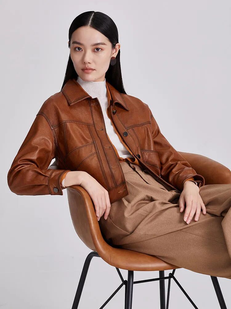 短款皮夹克搭配运动裤,恰好是“上短下长”的绝佳组合。面料是意大利100%进口小羊皮,皮面做了蜡感工艺处理,光泽细腻,映衬的色彩更柔和,细节的缝线也来自意大利进口蜡线,复古又显高级。回想一下,上一条可以带来这么多惊喜的裤子还是上一条——牛仔裤。