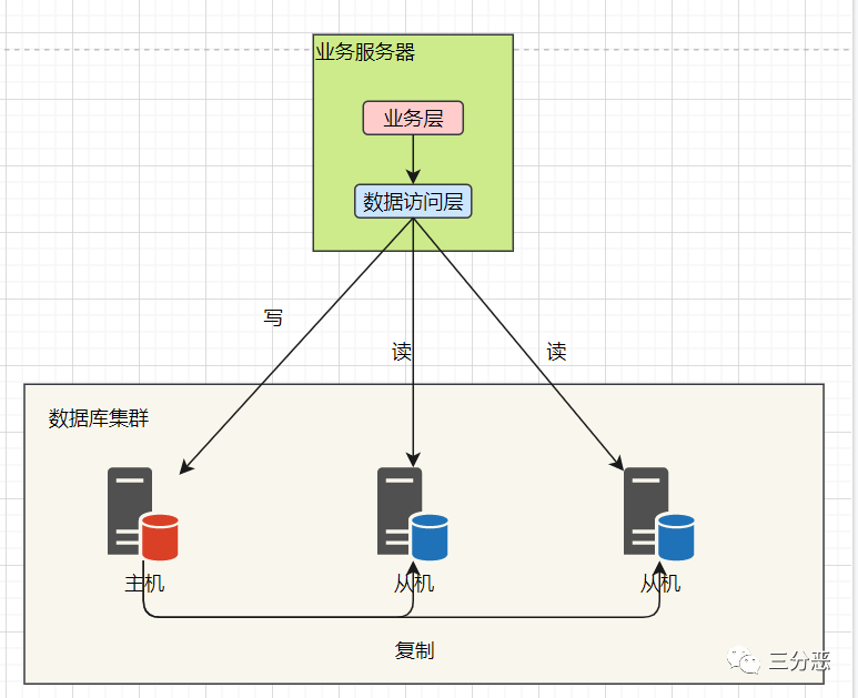 将读写操作区分开来,然后访问不同的数据库服务器,一般有两种方式:程序代码封装和中间件封装。