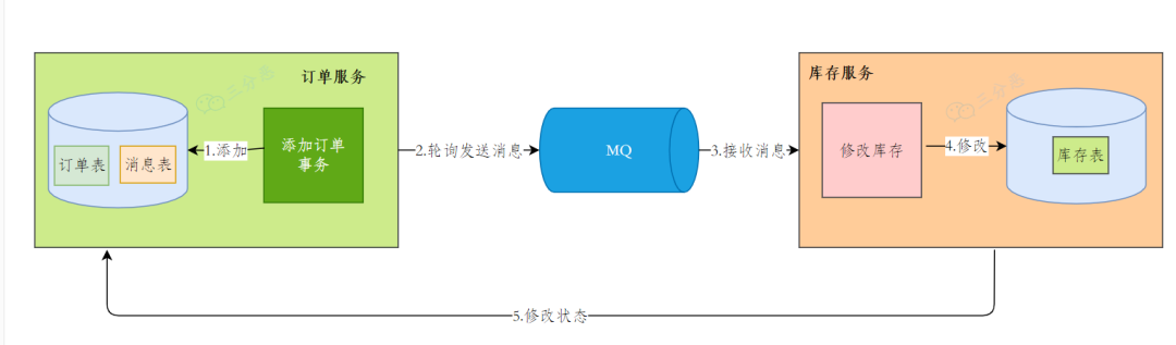例如,可以在订单库新增一个消息表,将新增订单和新增消息放到一个事务里完成,然后通过轮询的方式去查询消息表,将消息推送到MQ,库存系统去消费MQ。