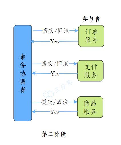 两阶段提交的思路可以概括为:参与者将操作成败通知协调者,再由协调者根据所有参与者的反馈情况决定各参与者是否要提交操作还是中止操作。