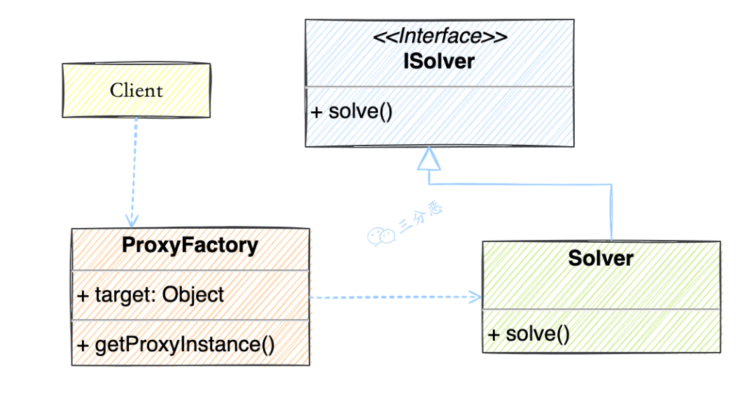 代理类:SolverProxy,代理类也要实现接口,并且还要维护一个目标对象。
