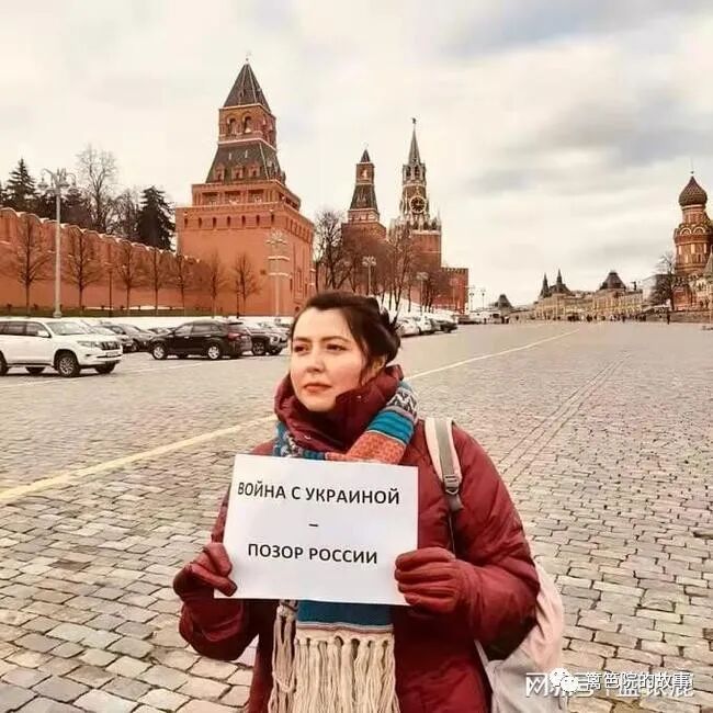 在莫斯科广场的中心,一名妇女举着“与乌克兰的战争,为俄罗斯感到羞耻。”的标语向路人展示自己反战的主张。